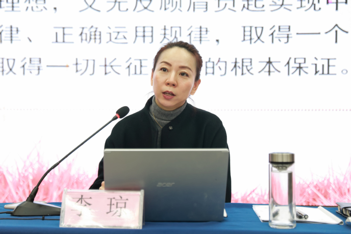 李琼以“守初心,担使命,走好新时代长征路”为主题,详尽阐释了长征的历史地位、长征精神的重要意义,要求广大党员、干部“牢记党的初心和使命,牢记党的性质和宗旨,坚定理想信念,坚定不移贯彻党的理论和路线方针政策,不断跨越前进道路上新的“娄山关”、“腊子口”,在实现中华民族伟大复兴的历史进程中走好新时代的长征路。”随后,李琼从“红军长征历史回顾”、“长征标志性事件回顾”、“长征标志性事件回顾”和“如何走好新时代长征路”四个方面对长征和长征精神进行了阐述。在“如何走好新时代长征路”部分,李琼结合自己的职业理想、岗位职责谈一名共产党员应该如何“不忘初心牢记使命”,真正做到“胸怀理想,用理想之光照亮奋斗之路”;结合2021年我市“720”暴雨灾害期间和师生一起抗洪的亲身经历阐述“身边的师生就是人民”,如何才能做到“不忘初心,永远与人民心连心依靠人民”。结合我校的转设工作,李琼期望全体教师要切实增强本领,立足新时代,解决新矛盾,确定新目标、明确新定位,开启新征程,为三全学院的发展贡献自己的力量和智慧。