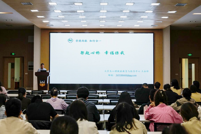 5月26日,为提升辅导员队伍的综合素养和能力水平,以积极的精神面貌和饱满的工作热情为学生成长成才保驾护航,更好地指导辅导员关爱自身心理健康,我校特邀河南科技学院心理健康教育教研室主任王永铎在行政楼三楼报告厅对我校全体辅导员开展“架起心桥 幸福你我”心理专题讲座。他从“压力来源、压力影响身心的表现、压力影响身心的机制以及压力管理的技术四个方面展开阐述,向大家介绍了辅导员该如何识别压力、接纳情绪,并有效提升压力调适与情绪管理的方法技术,并指导大家如何正确认识心理健康,更好地排解压力和舒缓心情。