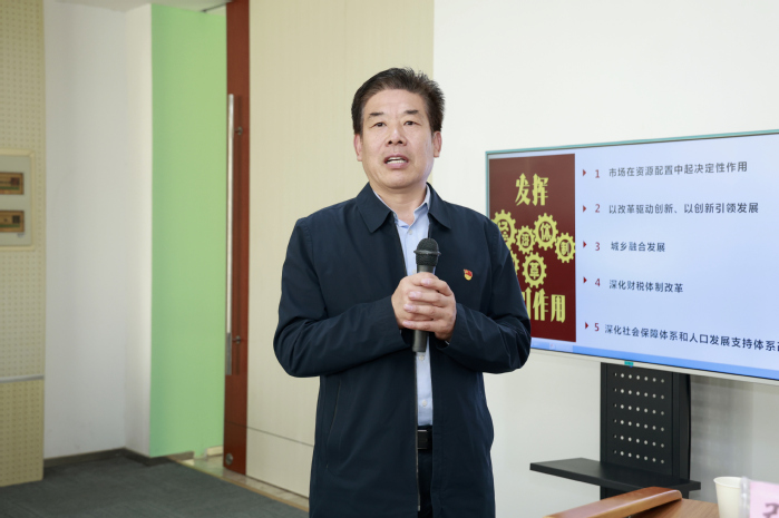 张向东以《二十届三中全会经济体制改革的五条主线》为主题,从“深刻领会三中全会《决定》精神实质”“深化经济体制改革的五条主线及相关举措”“推进教育、科技、人才'三位一体'协同融合发展”几个部分进行深入解读。他指出,经济体制改革对其他方面改革具有重要影响和传导作用,重大经济体制改革的进度决定着其他方面很多体制改革的进度,具有牵一发而动全身的作用。在经济体制改革的五条主线中,我们要坚持市场在资源配置中起决定性作用这一基本改革取向下,重点通过深化财税体制和民生保障体系这两个基础性改革,实现创新驱动和城乡融合发展这两个未来迈向中国式现代化的基本路径。