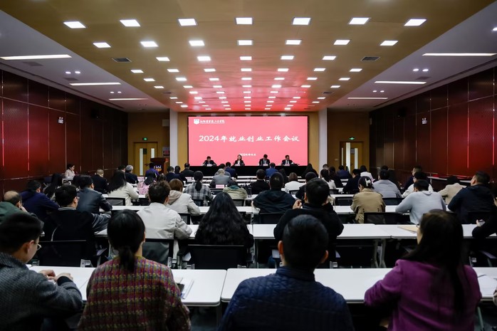李琼发表讲话。她首先对2023年就业创业工作进行回顾,对取得的成绩与进步给予高度肯定,随后,又对2024年就业创业工作进行详细部署。她指出,一要强化顶层设计,增强就业工作“统筹力”,上下联动“促就业”。她强调,就业工作是一项系统工程,要深入贯彻落实就业工作“一把手”工程,持续开展书记院长访企拓岗促就业专项行动,分类组建职业规划、就业指导、创新创业校内专家师资队伍,统筹联动,推进学校就业创业工作有力、有序、有效开展;二要精准校园招聘,加大就业政策“引导力”,整合资源“稳就业”。要加快市场化岗位建设,充分发挥校园招聘主渠道作用,做好就业专项政策宣传,强化政策性岗位吸纳作用,深挖校友资源,加快区域校友组织建设,多渠道、多途径促进毕业生就业;三要深化双创建设,提升就业帮扶“保障力”,牢守底线“保就业”。学校要推进创新创业工作内涵化建设,指导大学生通过创业带动就业;做好重点群体毕业生就业兜底帮扶,严守就业统计工作底线,用心用情保就业。