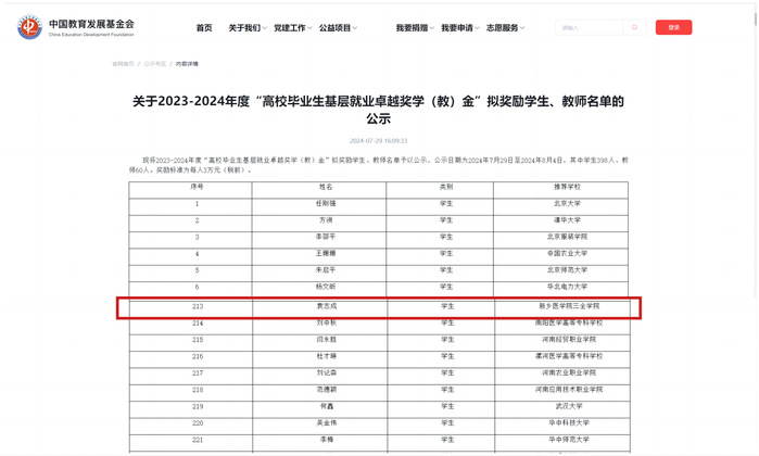 为深入学习贯彻习近平总书记重要回信精神,落实党中央、国务院关于引导和鼓励高校毕业生到基层就业的决策部署,由教育部高校学生司(高校毕业生就业服务司)、教育部学生服务与素质发展中心共同指导,中国长江三峡集团有限公司出资,中国教育发展基金会特设立“高校毕业生基层就业卓越奖学(教)金”。经过层层选拔,我校2018届毕业生袁志成获评2023-2024年度“全国高校毕业生基层就业卓越奖学(教)金”,这是我校首次获得该项奖项。据悉,本次教育部共评选398名毕业生,其中,河南省有21名毕业生获得该项奖学(教)金。