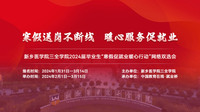 为搭建毕业生和用人单位双向选择桥梁,学校组织“寒冬送岗 暖心护航—2024届药学类专业毕业生实习就业双选会”;联合就业桥举办“寒假送岗不断线 暖心服务促就业”新乡医学院三全学院2024届毕业生“寒假促就业暖心行动”网络双选会;同时,学校统筹双院,通过微信公众号、QQ群等方式搜集推送招聘信息200余条。