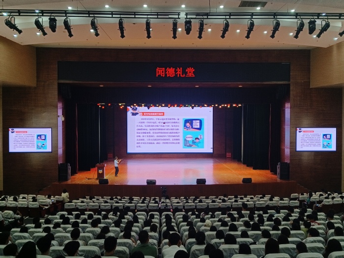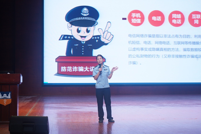 为落实学校关于新生安全教育的工作要求,切实增强新生的安全意识和防范电信网络诈骗的能力,近日,我校邀请平原示范区打击治理电信网络犯罪联席办公室防诈警员司念,在闻德礼堂为大一新生开展“新生入学教育-防电信诈骗”专题讲座,各书院大一新生、新生辅导员等共计900余人参加。