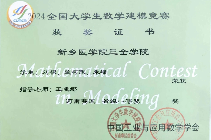 近日,在2024年全国大学生数学建模竞赛中,由我校智能医学工程学院王晓娜、丁丹指导的2023级数据科学与大数据技术专业孟柯欣、刘根、朱峰、詹金璈、甘鑫宇、陈昭毅等六名同学组成的两支代表队,分别斩获河南赛区省级一等奖、省级三等奖两项奖项。此次竞赛获奖为数据科学与大数据技术专业在国家A类学科竞赛中首次夺取佳绩,实现了零的突破。