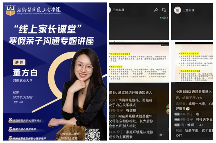 为贯彻落实《关于进一步加强寒假期间大学生心理健康教育工作》文件精神,推进家校协同心理育人工作,1月18日晚,我校邀请河南农业大学心理健康中心主任、北京师范大学心理学博士董方白在 “三全心理” 视频号上开启了一场以 “打破亲子沟通的‘隐形墙’” 为主题的线上心理健康教育公开课。此次公开课由学务部负责人张帆主持,线上观看终端数量达5千余人次,点赞量达1.8万。