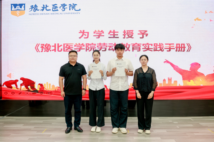 启动仪式上,顾欢代表学校对程栋的到来表示欢迎和感谢,表示我校将劳动教育纳入人才培养体系,深入贯彻“五育并举”的教育理念,并向现场学子提出三点希望:一要筑牢劳动价值根基,树立正确劳动观;二要锤炼过硬劳动本领,践行知行合一;三要淬炼卓越劳动精神,追逐匠心底色。2024级临床医学专业学生代表刘雯发言,她号召同学们积极弘扬劳动精神,在医学实践中锤炼本领,弘扬医者仁心,服务人民健康。随后,学务部负责人张帆郑重将劳动教育实践团团旗授予学生,仁智书院党总支书记马苏娟、智行书院党总支书记刘凯共同为学生代表颁发《豫北医学院劳动教育实践手册》。鲜红的实践团旗帜迎风飘扬,正式拉开我校新一阶段劳动教育实践活动的序幕。