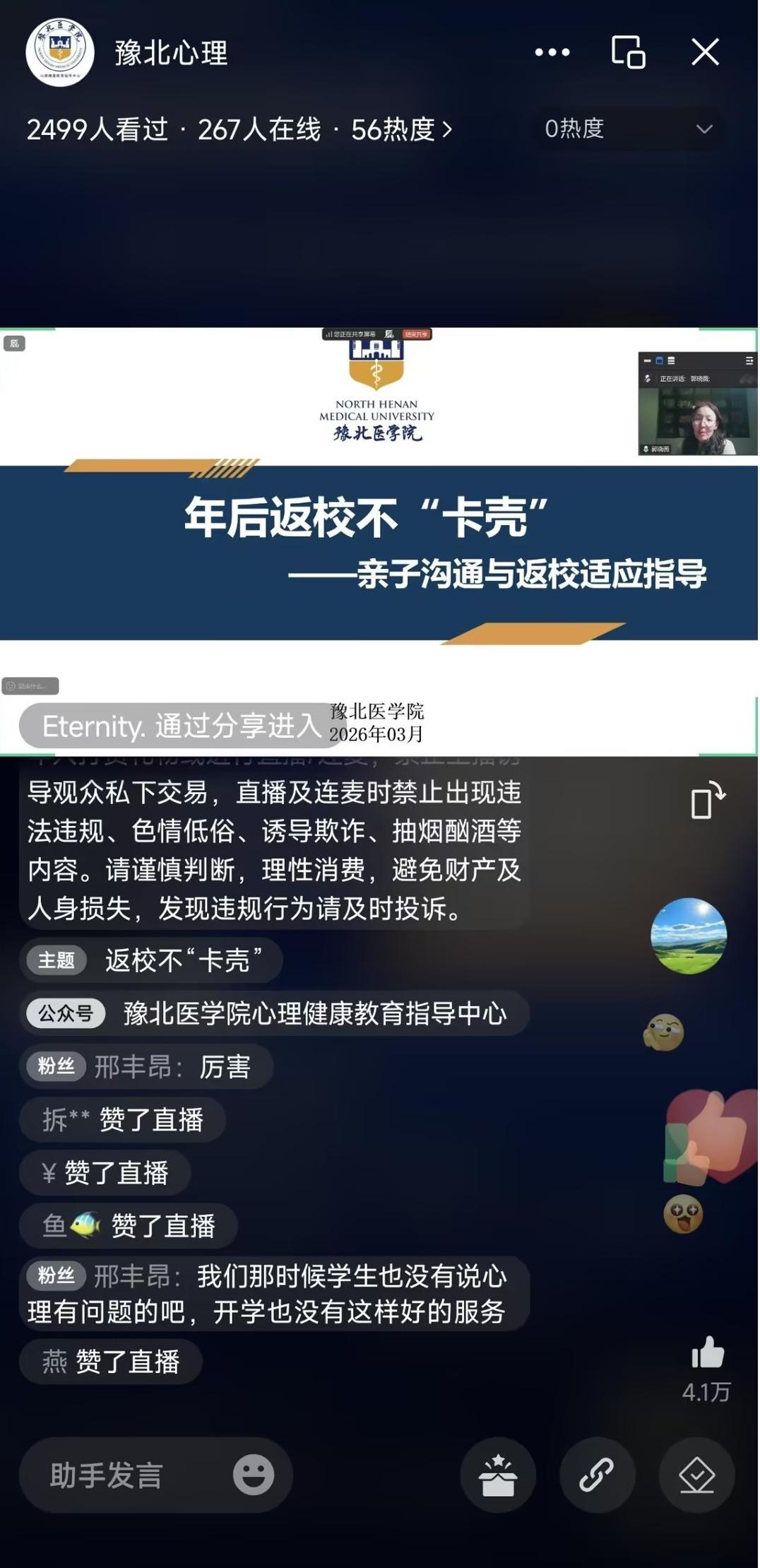 为深入贯彻落实“立德树人”根本任务,聚焦学生开学适应与考研复试的关键需求,凝聚家校协同育人合力,3月4日晚,学校特邀河南省高校学生心理工作室主持人郭晓薇教授,通过“豫北心理”视频号开展线上心理健康教育公开课。本次公开课由学生处副处长郝雷主持,线上观看终端达2507人次,点赞量超4.1万。
